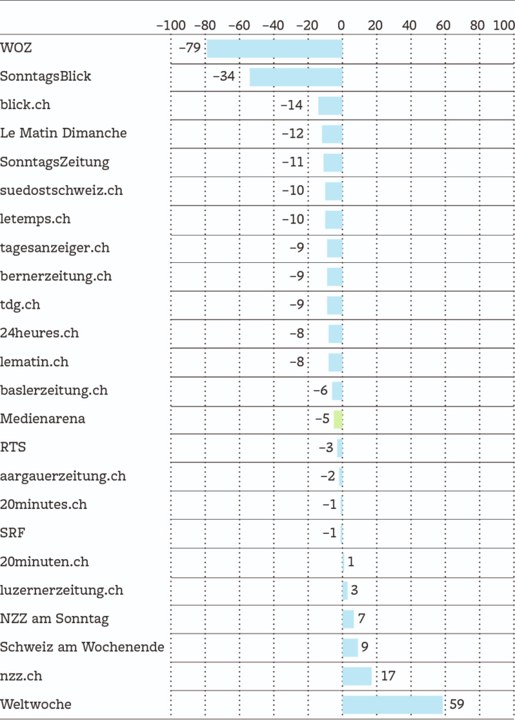 „Unsere Studie zeigt, dass sich die meisten Medien weder links noch rechts im politischen Spektrum positionieren, sondern relativ nahe der Mitte. Dies gilt insbesondere für die reichweitenstarken öffentlich-rechtlichen Sender SRF und RTS sowie die Pendlerzeitungen 20 Minuten/20 Minutes, die sich als unparteiische Reporter präsentieren“, sagt Linards Udris, Autor der Studie und stellvertretender Forschungsleiter des fög.“